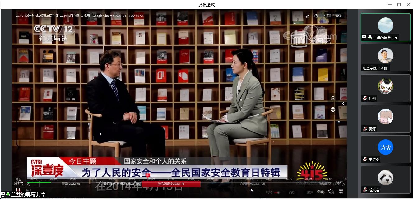 公司在物探楼214组织师生收看《“千万师生同上一堂国家安全教育课”主题公开课》《为了人民的安全——全民国家安全教育日特辑》专题视频,班级员工干部通过腾讯会议一同参与。公司员工党支部利用线上线下结合方式,收看《高校国家安全公司产品风采展示活动》系列学习视频。
