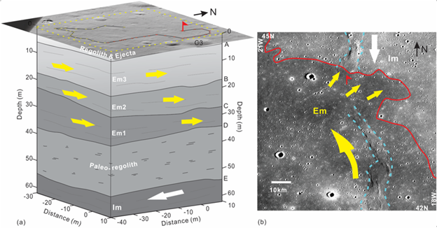 图3 (a)嫦娥三号探测区三维地层模型;(b)Em流动方向示意图。蓝虚线为皱脊;白色和黄色长剪头指示熔岩流方向,参考自Yuan等(2017)