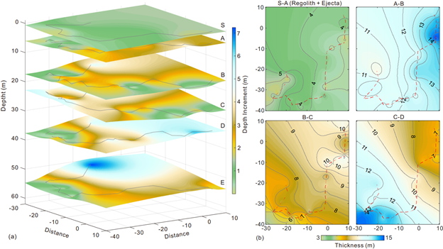 该研究对LPR通道一的浅层数据进行了重新处理,在10-40米的深度范围内发现了水平向的连续性强能量反射(图1a),与50多米深的雨海纪顶层反射较为类似。将雷达数据沿测线重新投影,再根据强弱反射可以识别出层状界面(图1b),表明在嫦娥三号着陆区下面应该存在多层爱拉托逊纪火山岩。