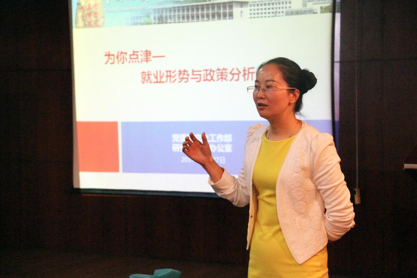 陈慧副部长从毕业生就业形势、毕业前准备、就业政策解读及就业指导资源的获取等四个方面为毕业生同学进行了讲解和指导。她分析了公司研究生就业的基本情况以及近年来就业市场的变化,解读了中央、地方以及公司各项就业、创业政策,尤其对理工科女生的就业情况进行了具体而又细致地分析,并针对女生就业难的问题提出了几点建议。随后,陈慧副部长就生源信息核对、协议书签订、户口迁移等事项进行说明,提醒毕业生同学尽早准备相关材料,并建议同学们积极了解企业招聘特点,提高就业竞争力。她希望毕业生们摆正就业心态,合理安排求职时间,全面地了解和认识自己,转变就业观念,树立正确的择业观,尤其要关注重要领域、重点行业。