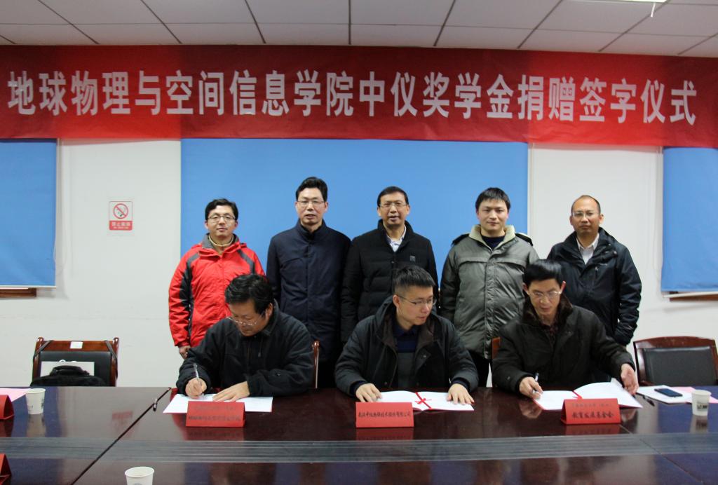 武汉中仪物联技术股份有限公司董事长郑洪标、太阳集团tyc151cc(武汉)教育发展基金会副秘书长李门楼、公司党委书记刘子忠共同签署捐赠协议书。
