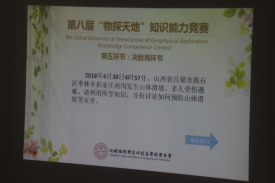 决胜局采取一题决胜负的模式,如何预防山体滑坡这一题看似简单。而实际上可以从许多方面进行展开作答。而且台下坐着的老师中,就有人进行者灾难防治的课题。这绝对不是可以蒙混过关的问题,对于这样一个需要充分思考的问题,五分钟时间也只是一眨眼的功夫。但我们团队都经历过了初赛与实践比赛环节,哪是那么容易屈服。