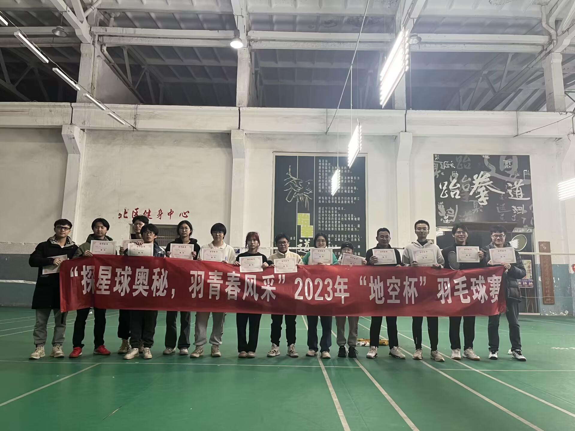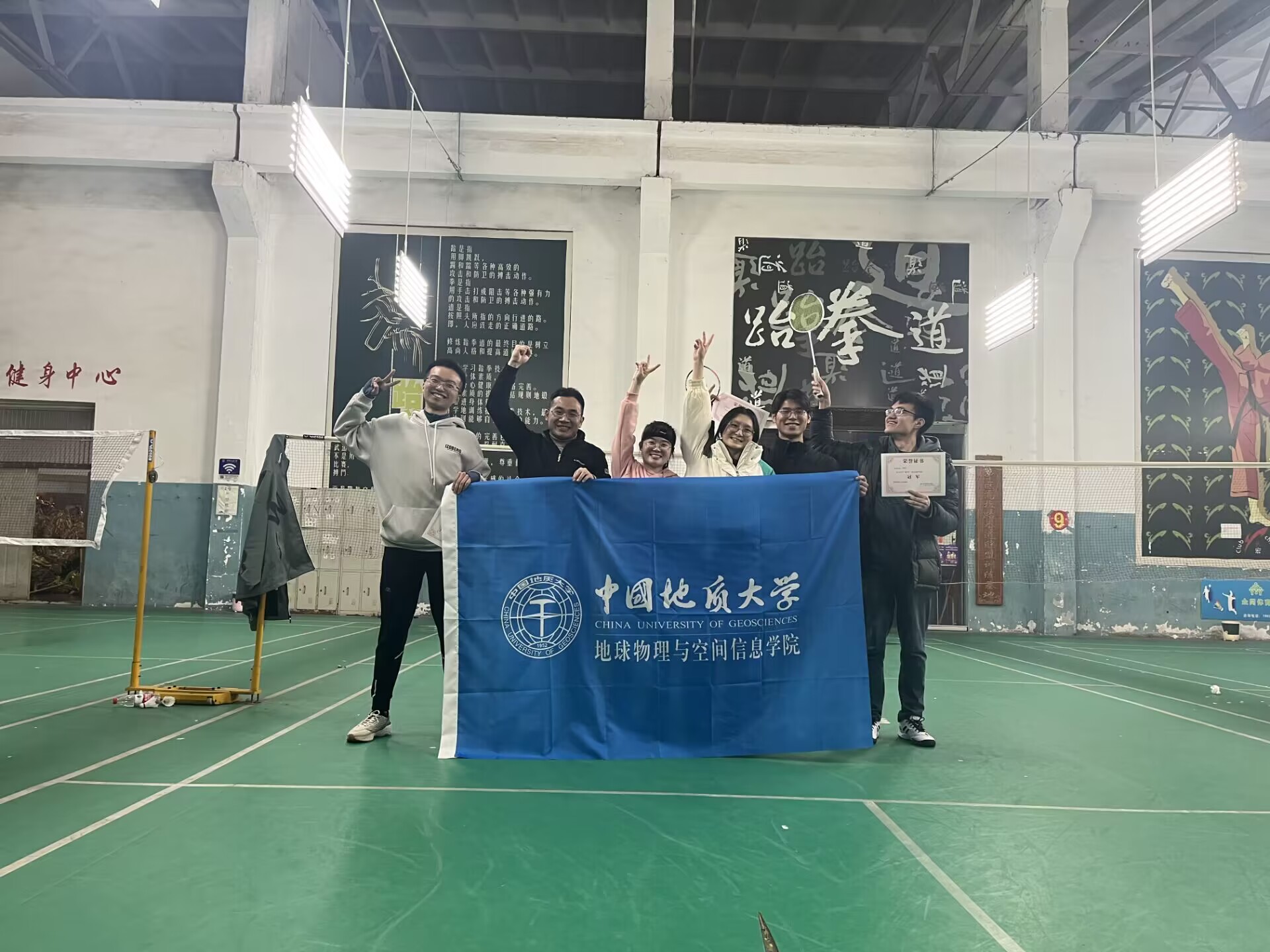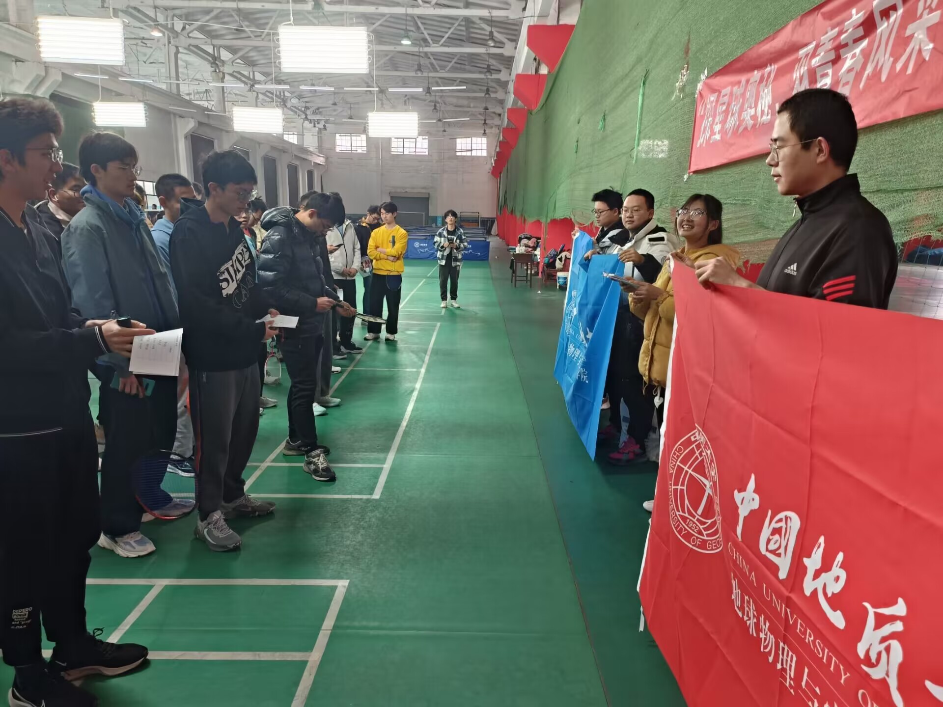 本次羽毛球比赛为同学们提供了展示体育技能、挑战自我极限、培育团队精神的舞台。比赛当天,赛场热火朝天,参赛队员将球技发挥地淋漓尽致,场边观众座无虚席,现场气氛活跃热闹。经过激烈角逐,12支队伍中的佼佼者纷纷涌现,最终团队获得积分最高的“物探小队”队杀出重围,问鼎冠军,排在第二的“这么菜是我不队”队荣获亚军。