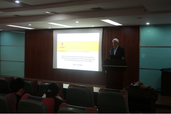 首先,Trinder教授对什么是可持续发展进行了讲解,从社会、经济和环境三个方面引入了可持续性指标,并对城市区域的可持续性、城市环境绿度空间的重要性以及绿地碎片化的影响的评价原则进行了介绍。随后,Trinder教授重点介绍了利用1987年至2017年遥感卫星对武汉与悉尼两座城市的城市化影响进行了回顾和研究,并展示了相关研究成果。这些结果也与世界上正在进行的相关研究成果进行了比较,令在场的研究生深受启发。最后在提问环节,Trinder教授回答了参会老师及员工提出的问题,并对大家提出了宝贵的建议。