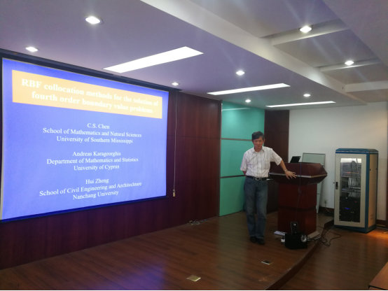 C.S.Chen(陈清祥)教授,台湾高雄人,1988年博士毕业于美国路易斯安那大学拉法叶分校,目前为美国南密西西比大学终身教授。他曾是SCI源刊物《Computers、Materials and Continua》的主编,目前是SCI源刊物《Journal of Engineering Analysis with Boundary Elements》的副主编和其它六个SCI源刊物的编委。他首次提出并将基本解方法应用于非齐次方程的数值模拟;首次提出了Kansas类的基本解方法用于模拟齐次方程;陈教授完成的著作"Discrete projection method"被认为构建起了数学与工程应用之间的桥梁。陈清祥教授发表学术论文100余篇,出版数值计算方面的专著3部,其中《The Method of Fundamental Solutions-A Meshless Method》是第一本关于基本解方法研究的专著,它对于基本解方法的发展有着里程碑的意义。
