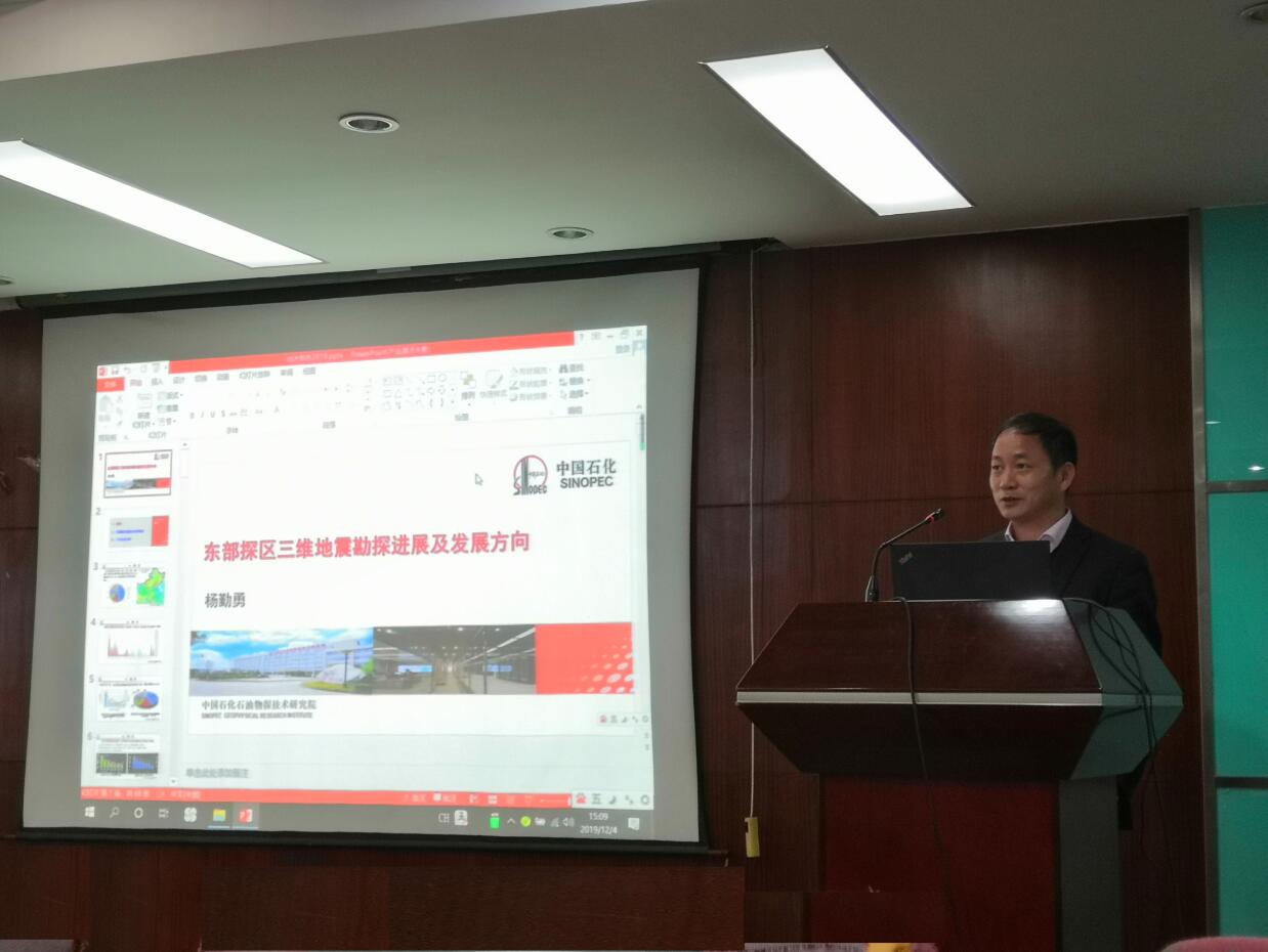 124日下午,应​太阳集团tyc151cc熊熊经理与顾汉明教授邀请,公司杰出员工、客座教授、中国石油化工股份有限公司石油物探技术研究院杨勤勇经理来公司访问,并在物探楼222学术报告厅做了“中国东部探区三维地震勘探进展及发展方向”的学术报告,全校从事油气地震勘探方向的师生到场聆听讲座。