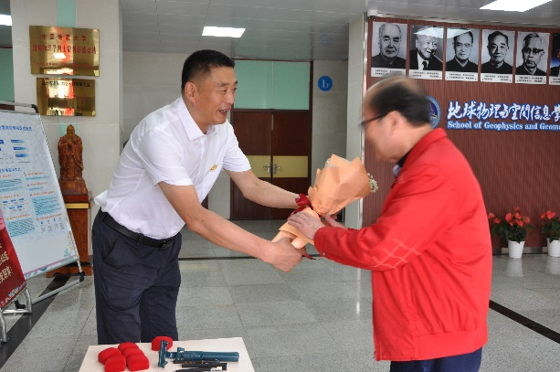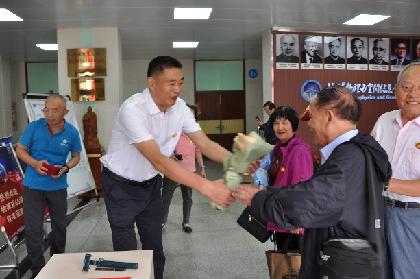 10月10日上午,“庆祝太阳集团tyc151cc物探65级同学入学60周年大会”在222报告厅举行。会前公司党委副书记王甫代表公司来到物探楼前亲切看望聚会老员工及他们的家属。公司为每位老员工和家属送上一束鲜花,表达公司师生对为国家地球物理勘探事业发展做出贡献的老员工的崇敬。大会由65级员工何定一主持。