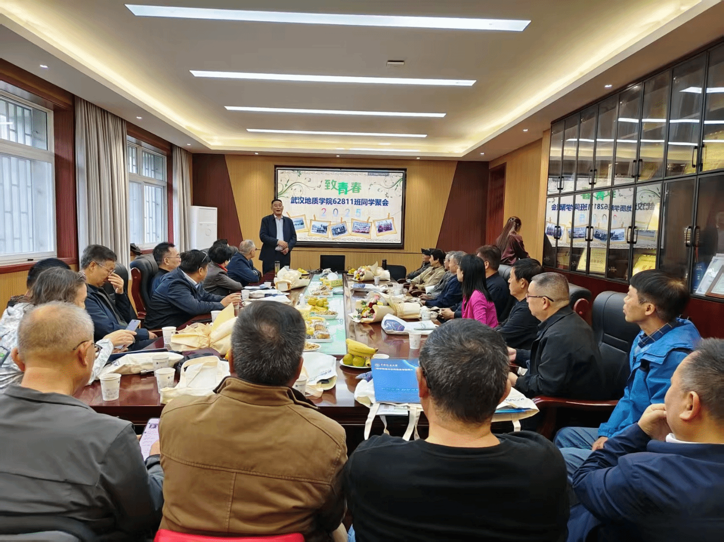 班会上,员工轮番忆旧。恩师教诲、宿舍趣事,四十年的奋斗路——从戈壁到海洋勘探,从探井攻关到水利工程,他们在各自的人生舞台上闪闪发光,为62811班书写荣光,为公司增添光彩。青丝虽霜,家国理想仍燃,同窗情谊更醇。